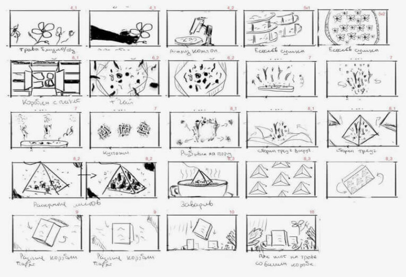 За основу сценария мы взяли презентацию клиента с описанием преимуществ чая, его особенностей и УТП. Важно было не только грамотно рассказать о продукте, но и создать связь между видео и текстом. Заказчик отправил нам документ, выверенный с точки зрения технологий сбора и производства чая, а мы придали ему эмоций, расставив смысловые акценты. За пару-тройку итераций сценарий был готов и согласован.