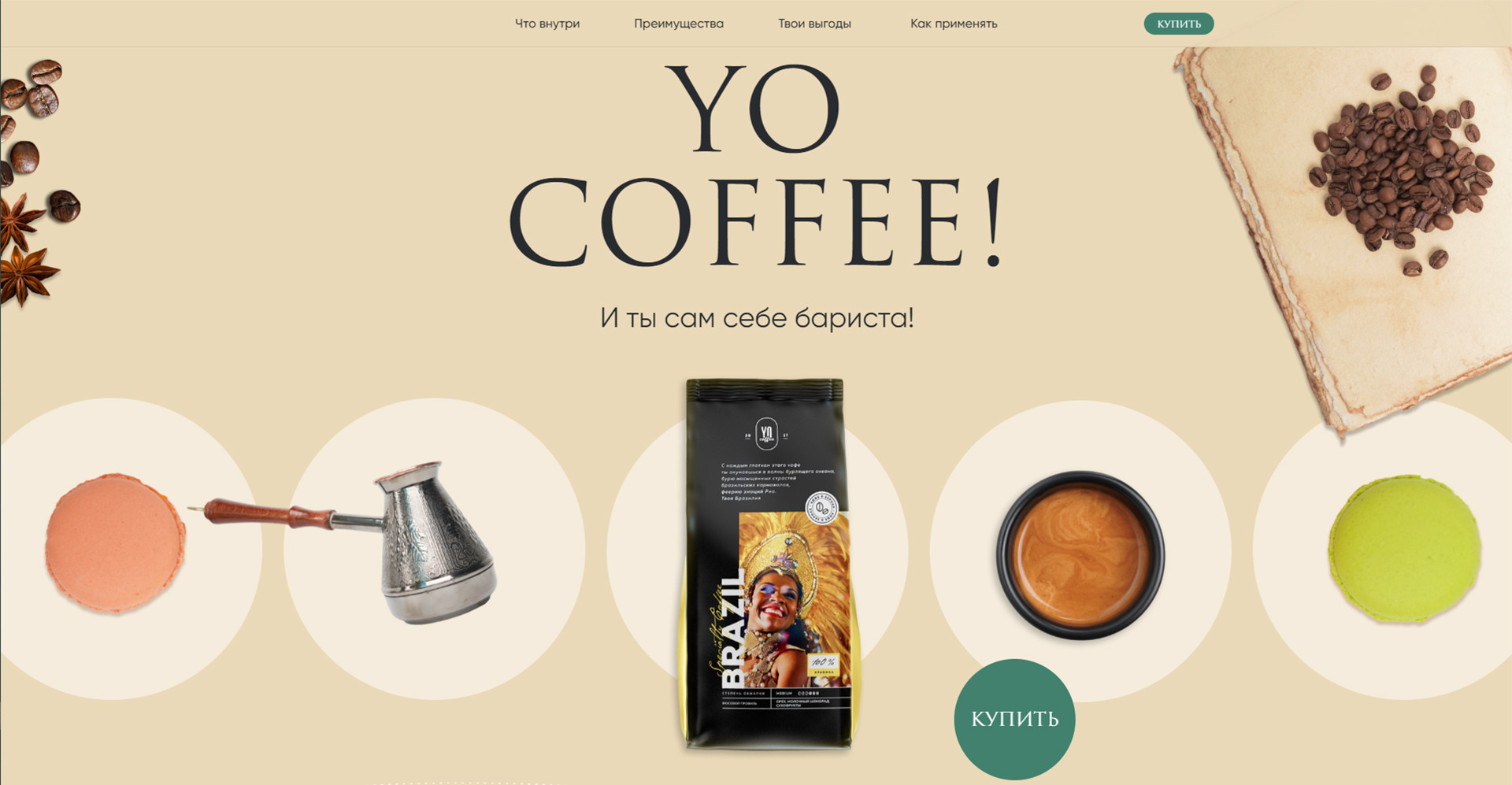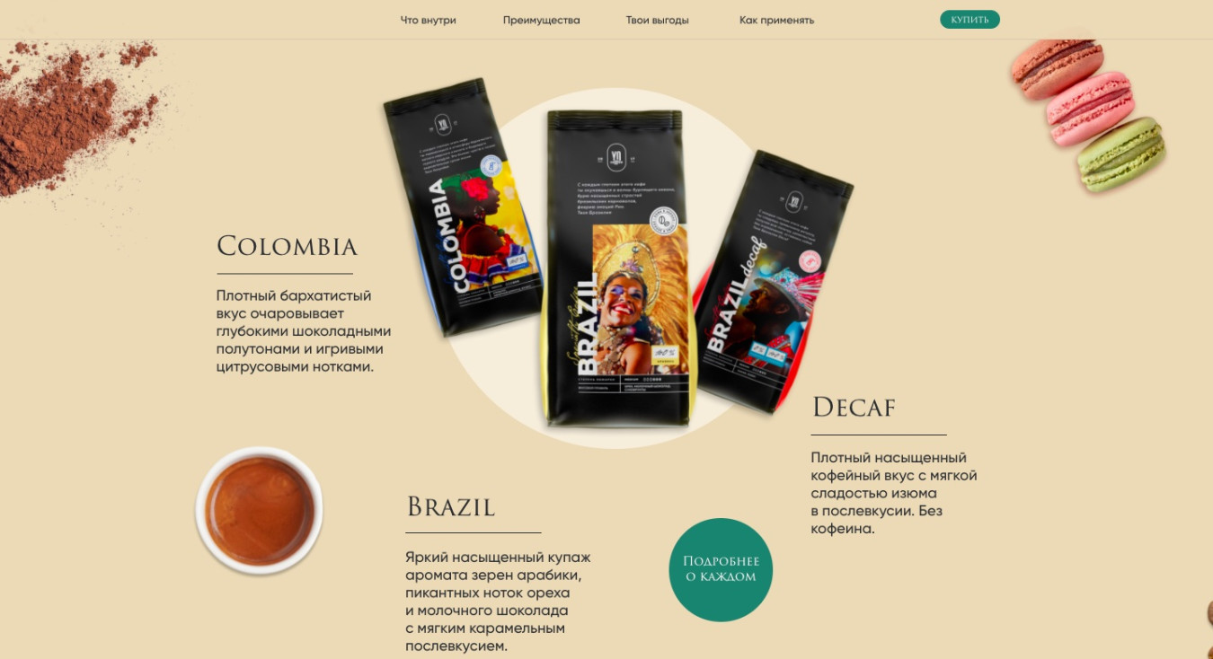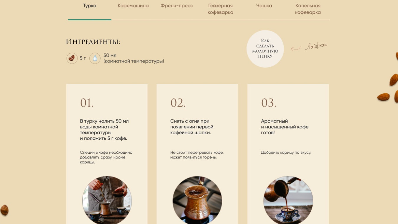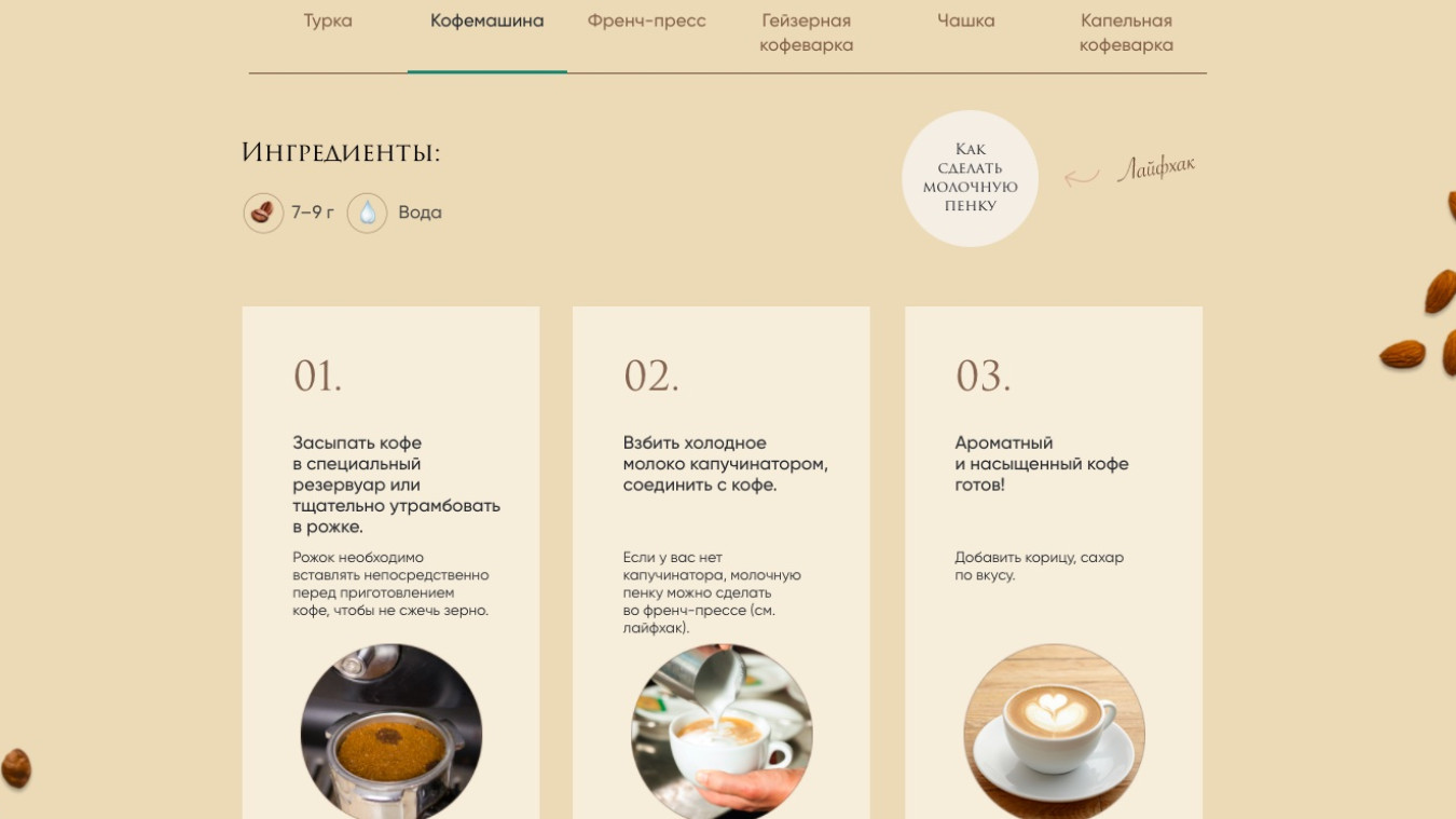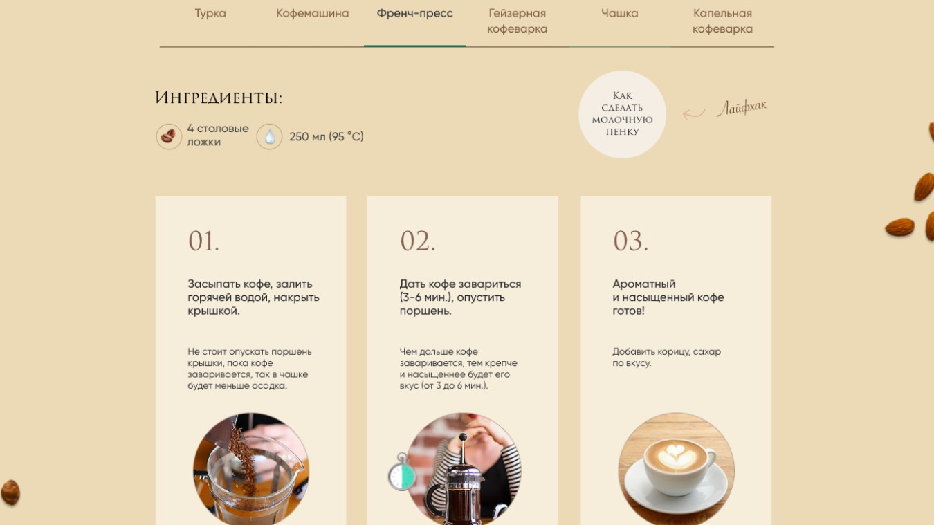 Мы дополнили сайт изображениями шоколадной крошки, корицы, цветных макарунов и миндальных орехов. А чтобы добавить интерактивности, поместили на страницы лайфхаки по приготовлению кофе разными способами: можно не только купить арабику на сайте, но и сварить ее, как настоящий бариста.