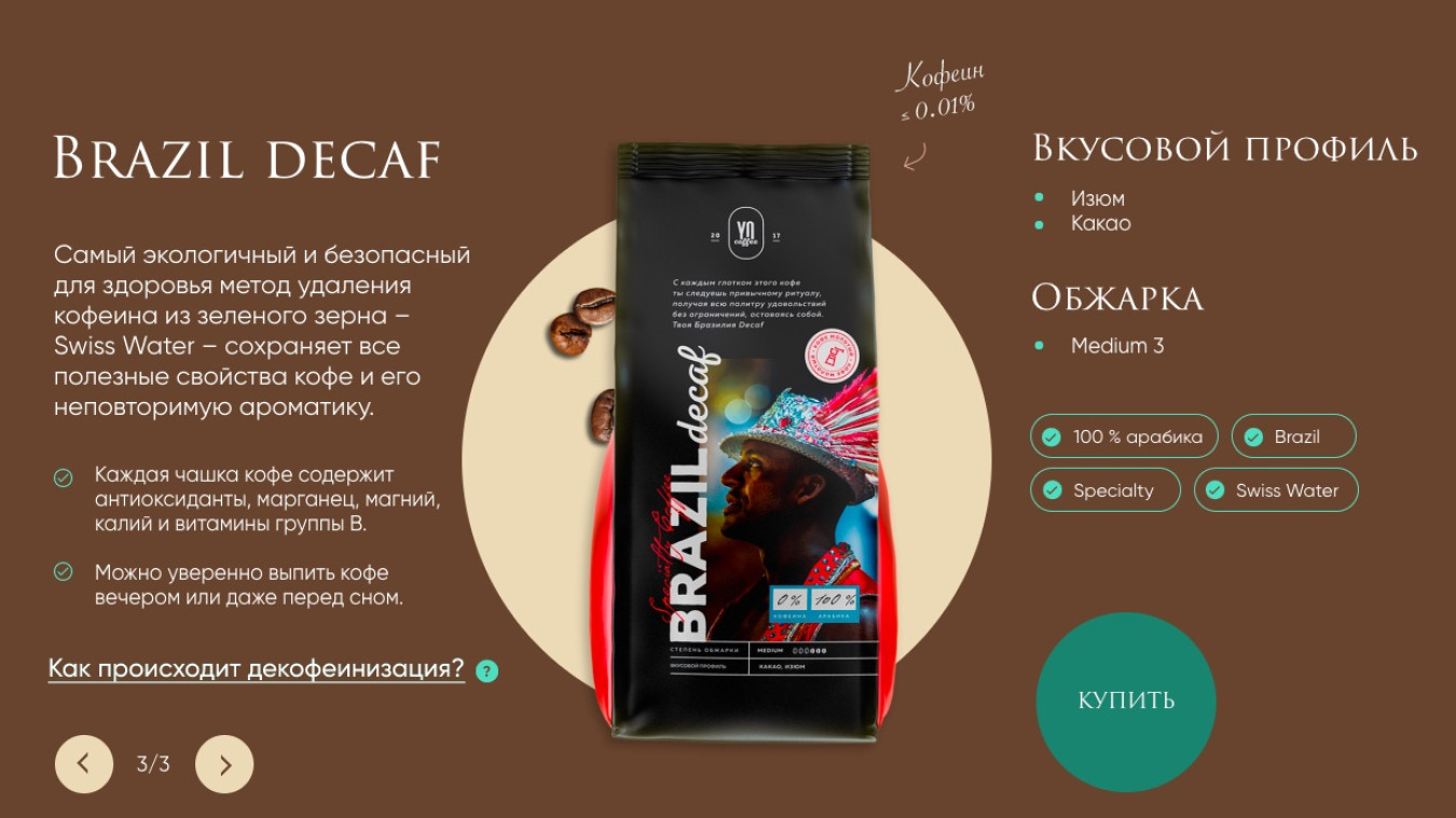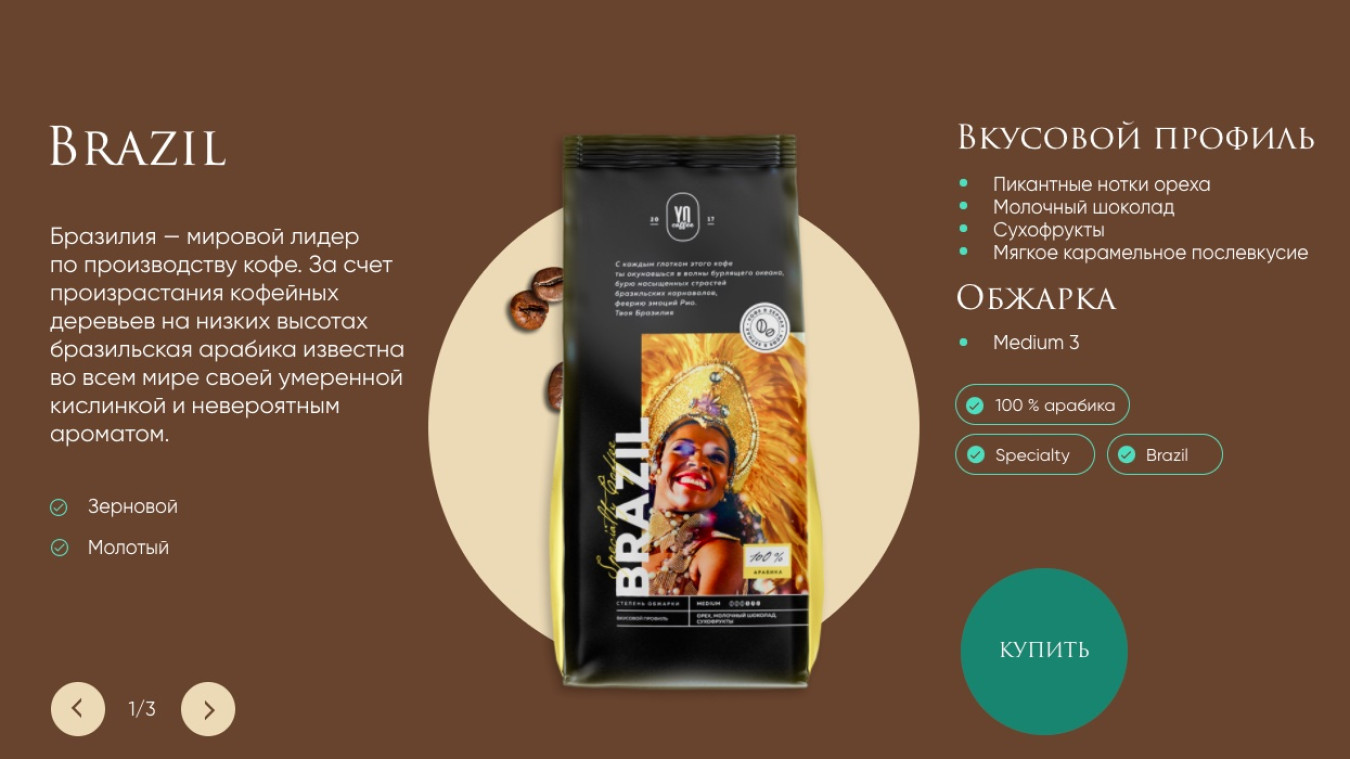 Но в процессе обсуждения появился совершенно противоположный образ: спокойный, в теплых шоколадных оттенках. Клиент хотел перенести на сайт атмосферу кофейни, которая располагает к неторопливому выбору обжаренной арабики.