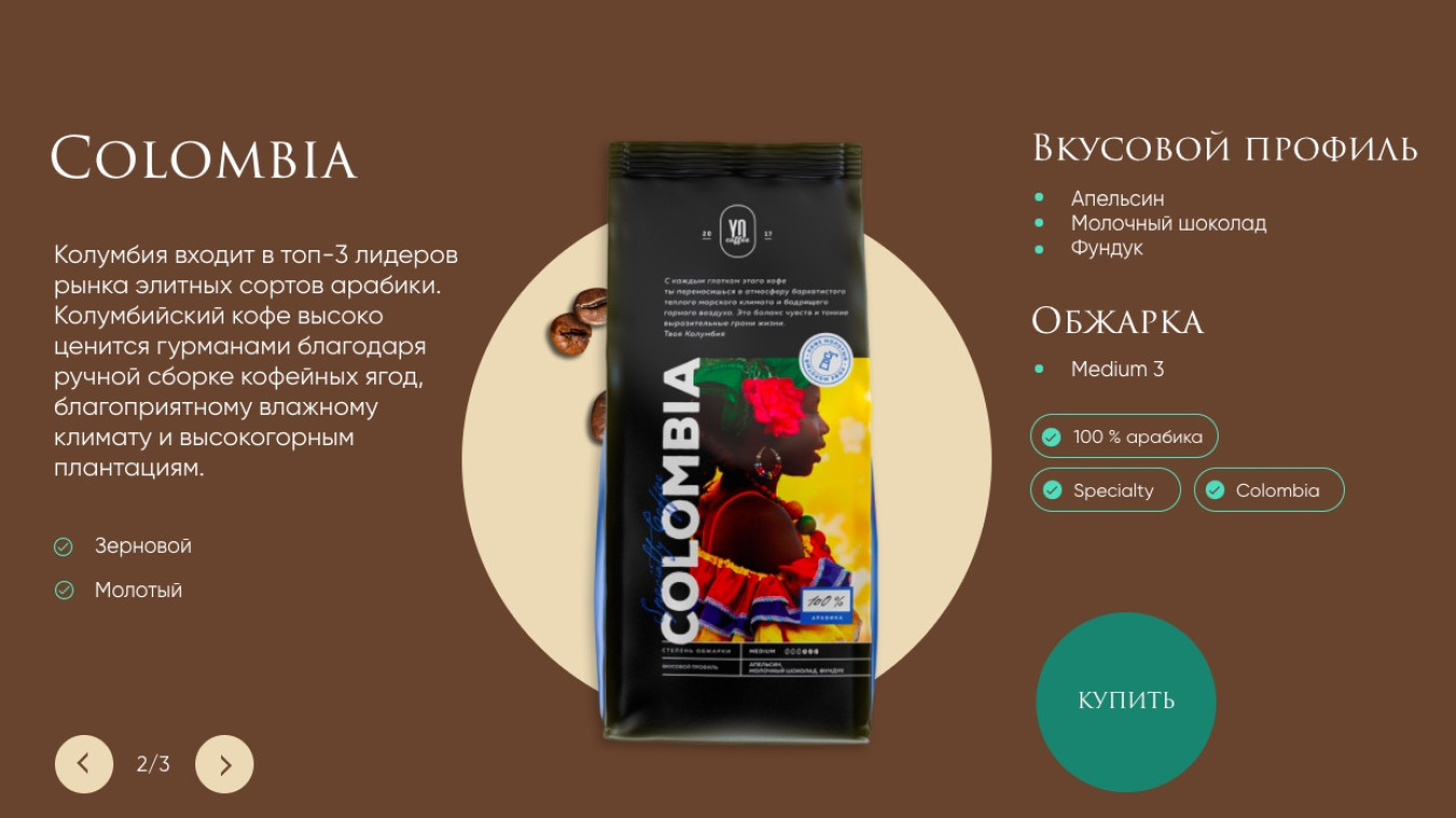 В центре внимания по-прежнему оставались яркие пачки с кофе. Бразилия, Колумбия — динамика была за цветными упаковками, а уютная атмосфера задавалась подложкой цвета кофе с молоком.