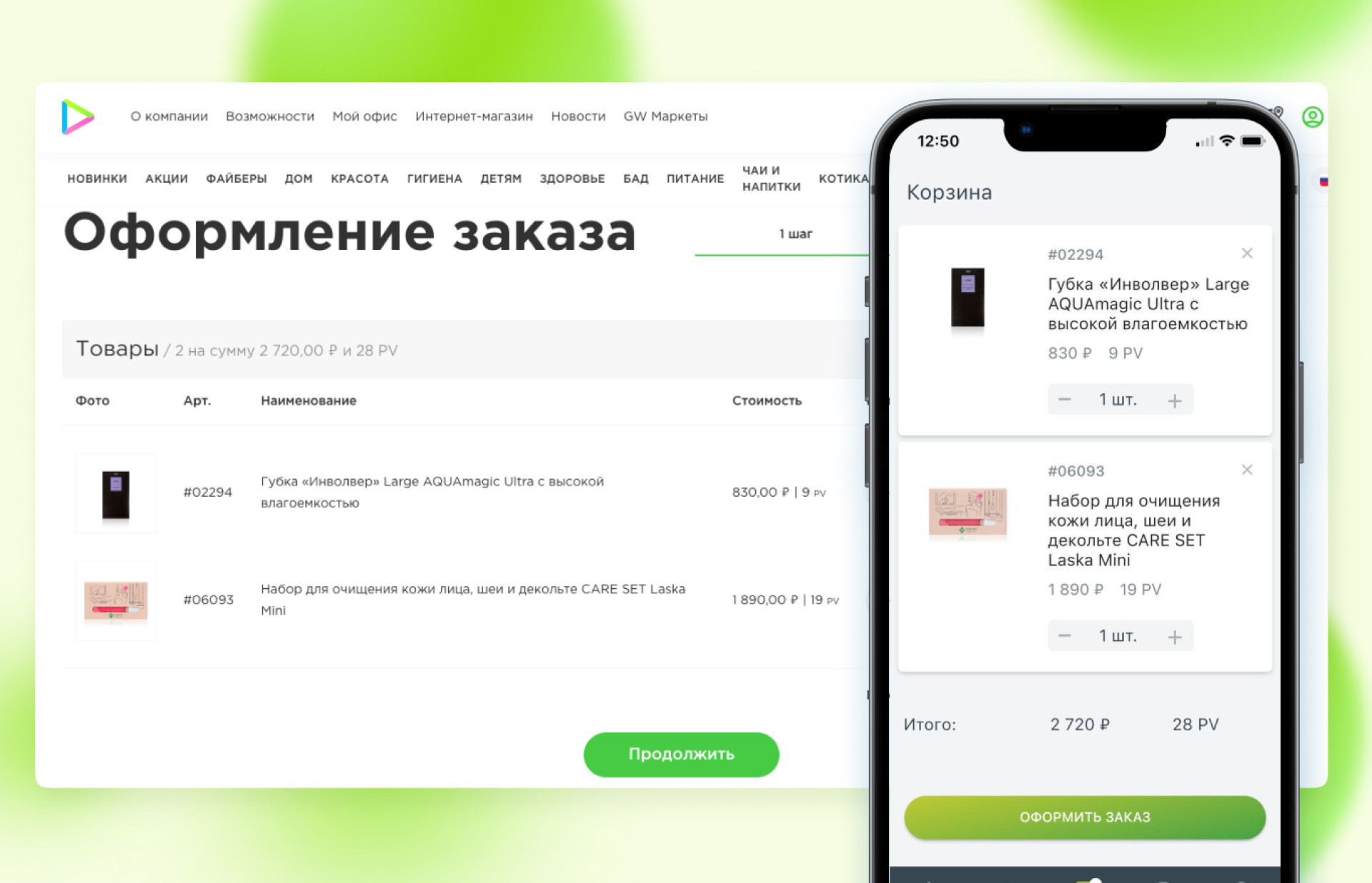 Оформить заказ в Greenway Global может только зарегистрированный партнер. Поэтому товары, положенные в корзину на сайте, автоматически отражаются в мобильном приложении. И наоборот, сформировав заказ в мобильном приложении, его не придется пересобирать на сайте — он сохранится, и с ним можно будет продолжить работать с любого устройства.