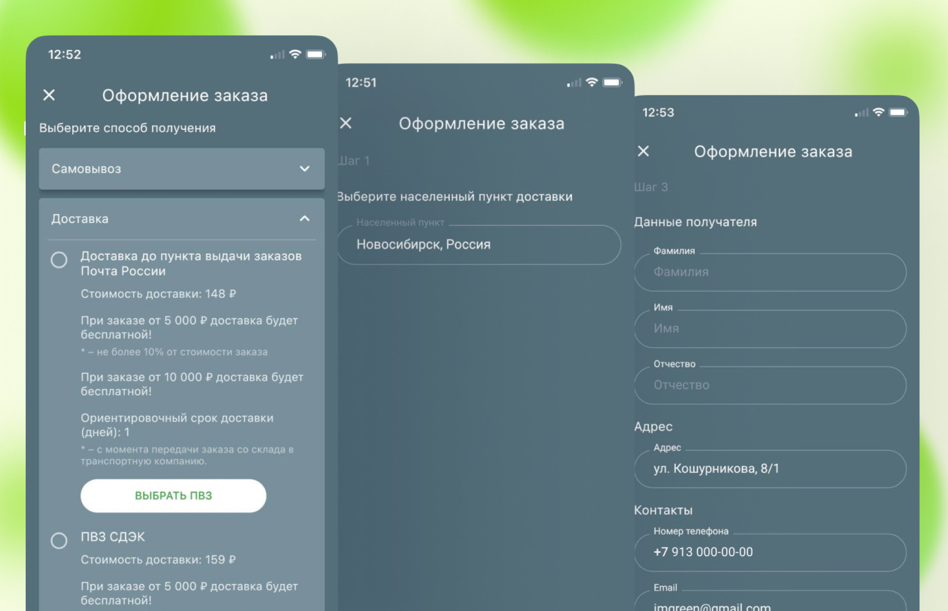 Оформление и оплата заказа в мобильном приложении происходит в пару кликов. Выбираем город и способ доставки, указываем получателя и контактные данные. Все, заказ оформлен.