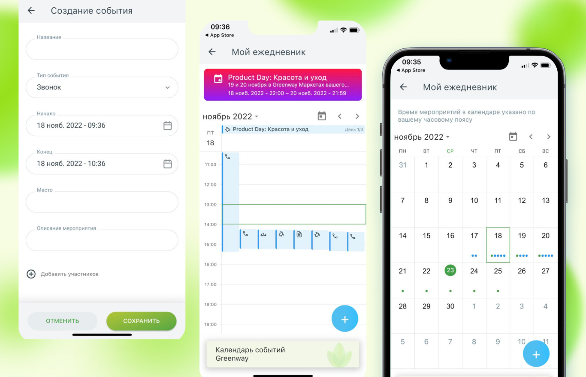Для этого в приложение Greenway Global интегрирован функционал ежедневника. Это планировщик, в который вносятся все рабочие задачи. С кем созвониться, кому написать, какие заказы оформить — чтобы в огромном потоке информации не забыть и не упустить что-то важное. Можно планировать свой рабочий график и своих партнеров, создавая совместные задачи.