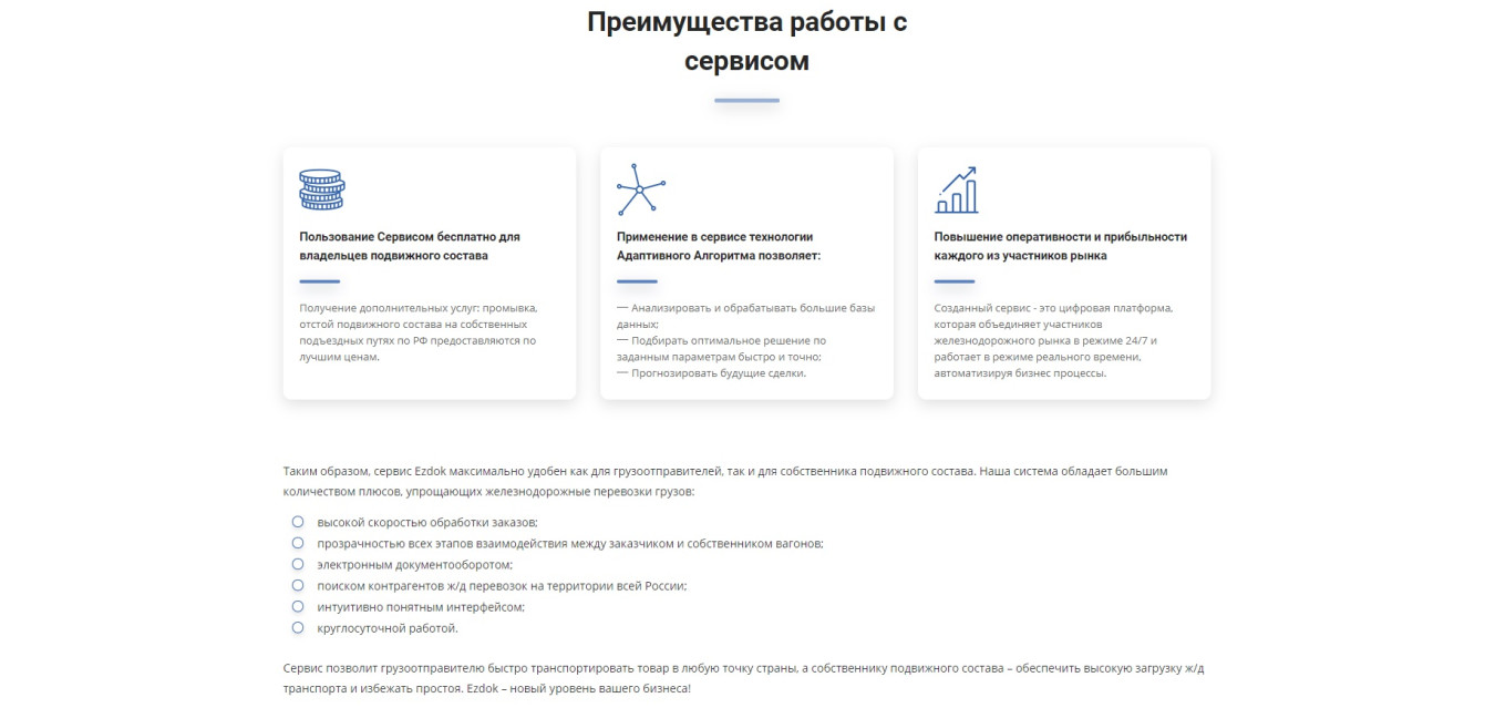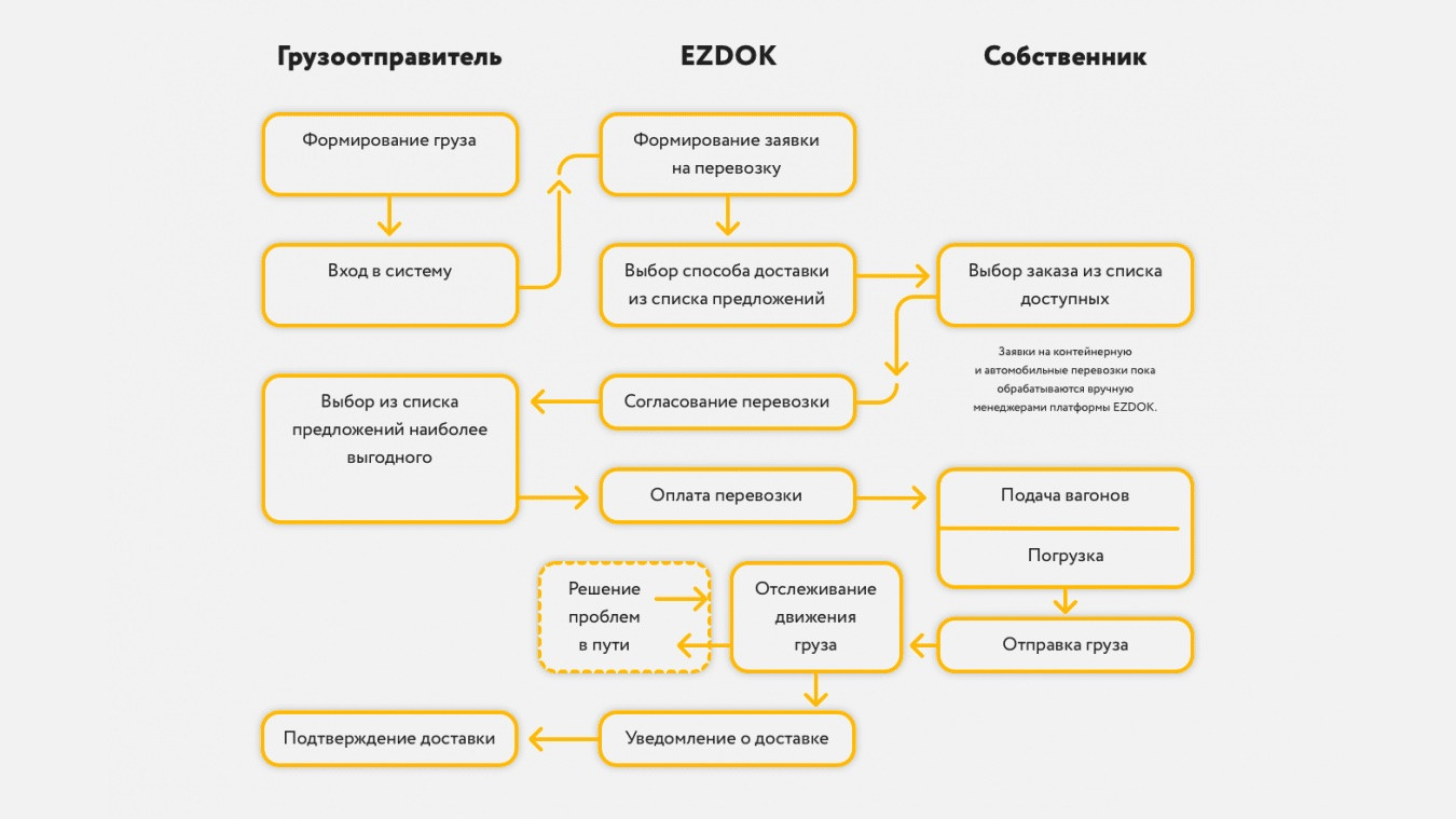 На платформе EZDOK грузоотправитель может подать заявку на мультимодальную перевозку груза с вагонами, контейнерами и автомобилями. Сервис составит несколько оптимальных по времени и стоимости маршрутов, из которых отправитель выбирает подходящий.