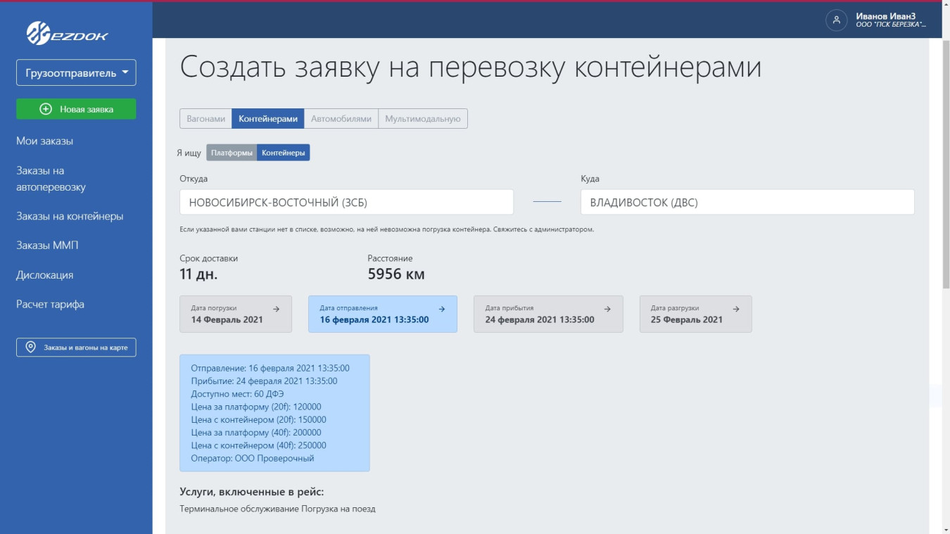 Грузоотправитель создает заявку на перевозку своих или арендованных у перевозчика контейнеров по расписанию рейсов. Благодаря интеграции c сервисом отслеживания вагонов и контейнеров RailLocator, контролирует состояние груза и его местонахождение в режиме онлайн.