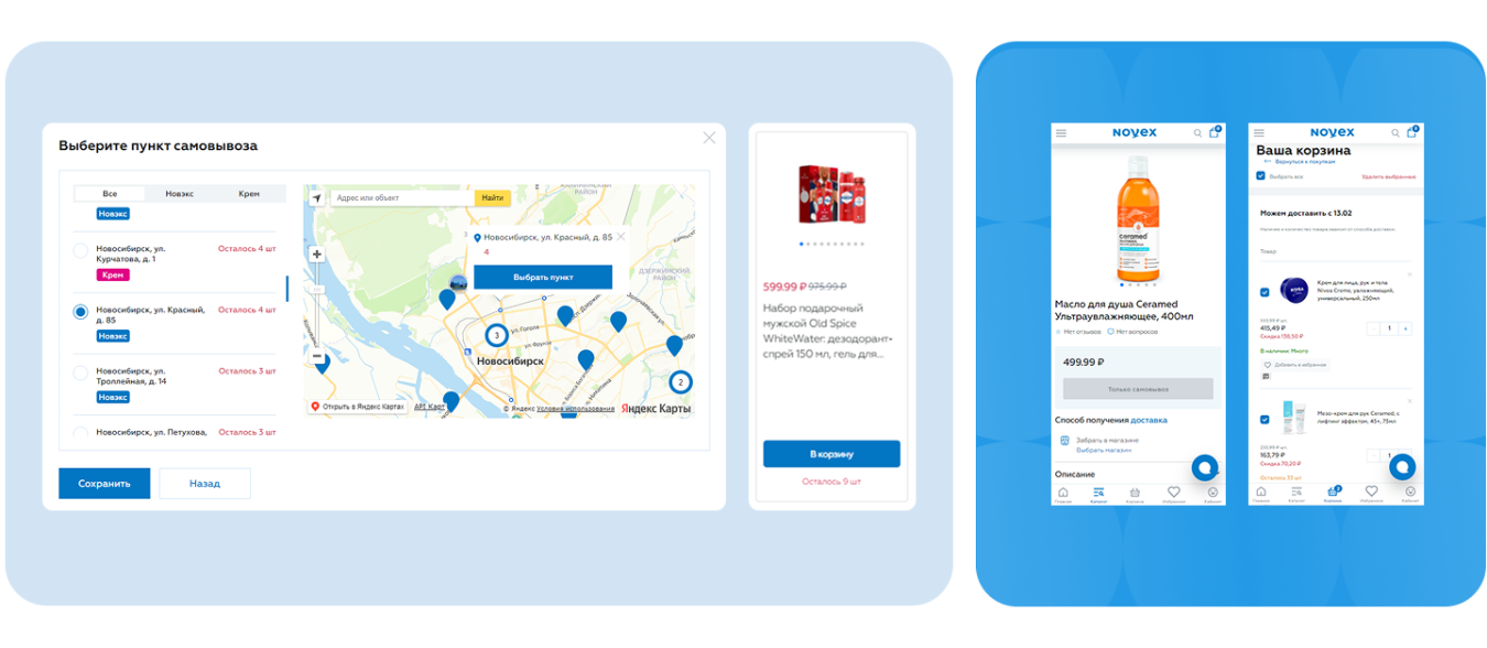 Ассортимент Novex был размещён на витринах Купер (сайт и мобильное приложение). Пользователь выбирает магазин, формирует корзину и оформляет заказ. Информация о заказе передаётся в Novex, где он собирается сотрудниками магазина, после чего в Купер отправляется статус готовности к доставке.