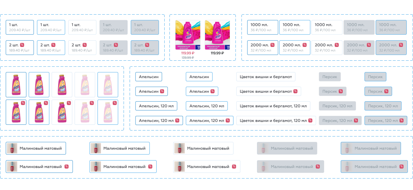 Объединение нескольких видов одного товара в одну карточку с возможностью выбора вариации внутри карточки (ТЗ в разработке)