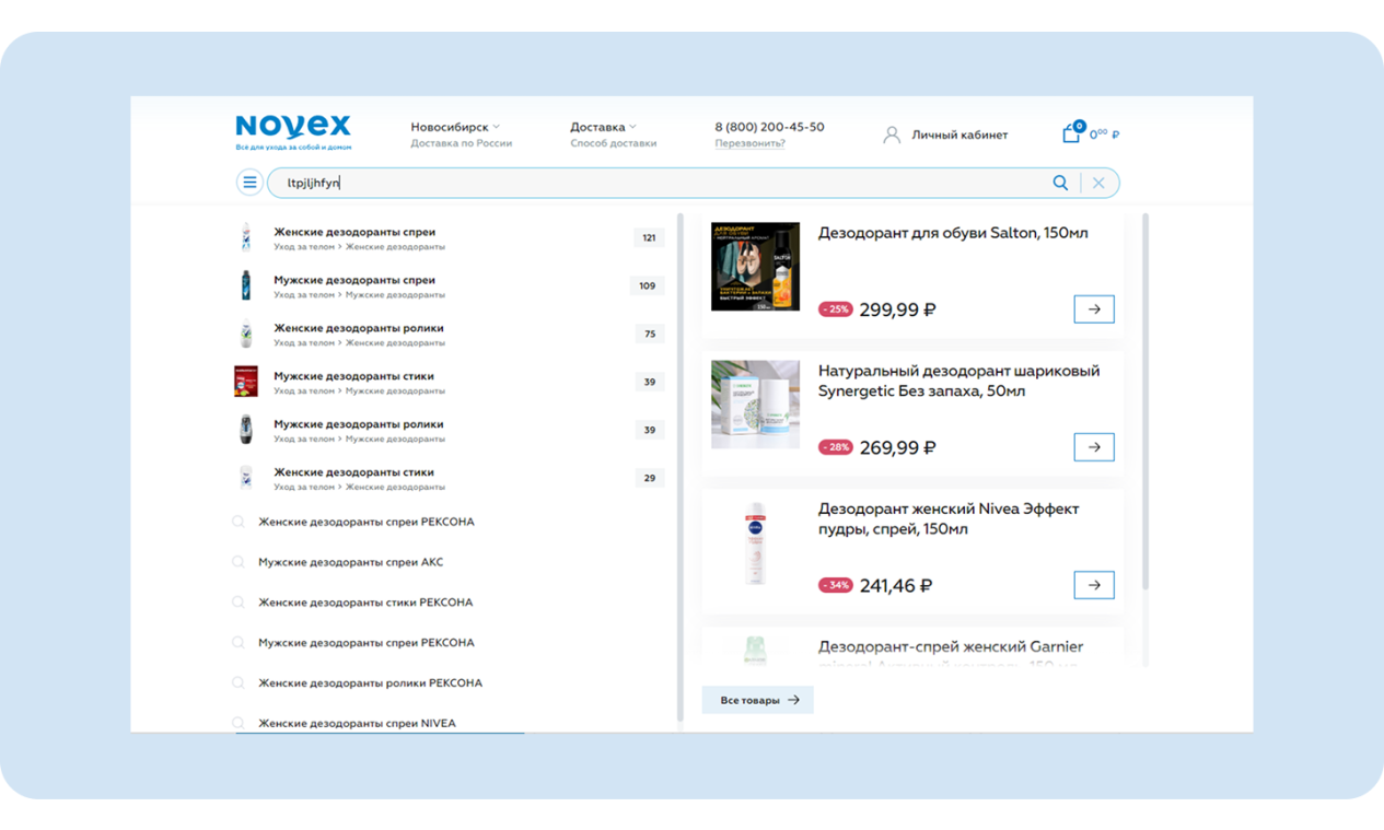 На сайт был внедрен сервис SearchBooster, предназначенный для работы с большим ассортиментом и повышения качества навигации по каталогу.