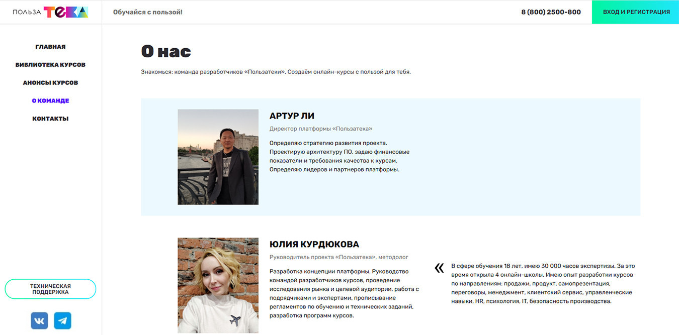 Мы дали пользователям возможность познакомиться с командой Polzateka. Создав страницу «О команде», рассказали о методистах и учителях, презентовали опыт организаторов, чтобы повысить доверие будущих учеников к платформе.