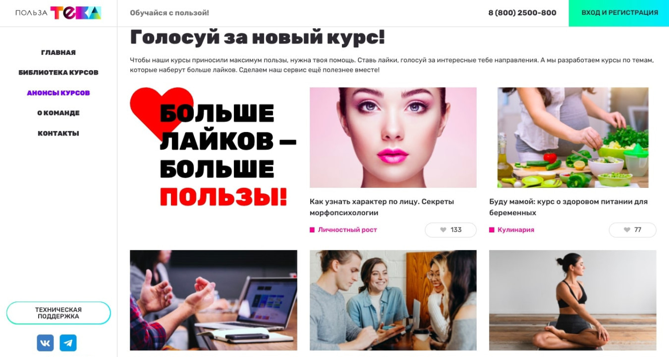 Также на платформе можно не только купить готовые курсы, но и определить тот, который появится следующими. Пользователь голосует за понравившуюся тему, и администраторы определяют фаворита по числу лайков.
