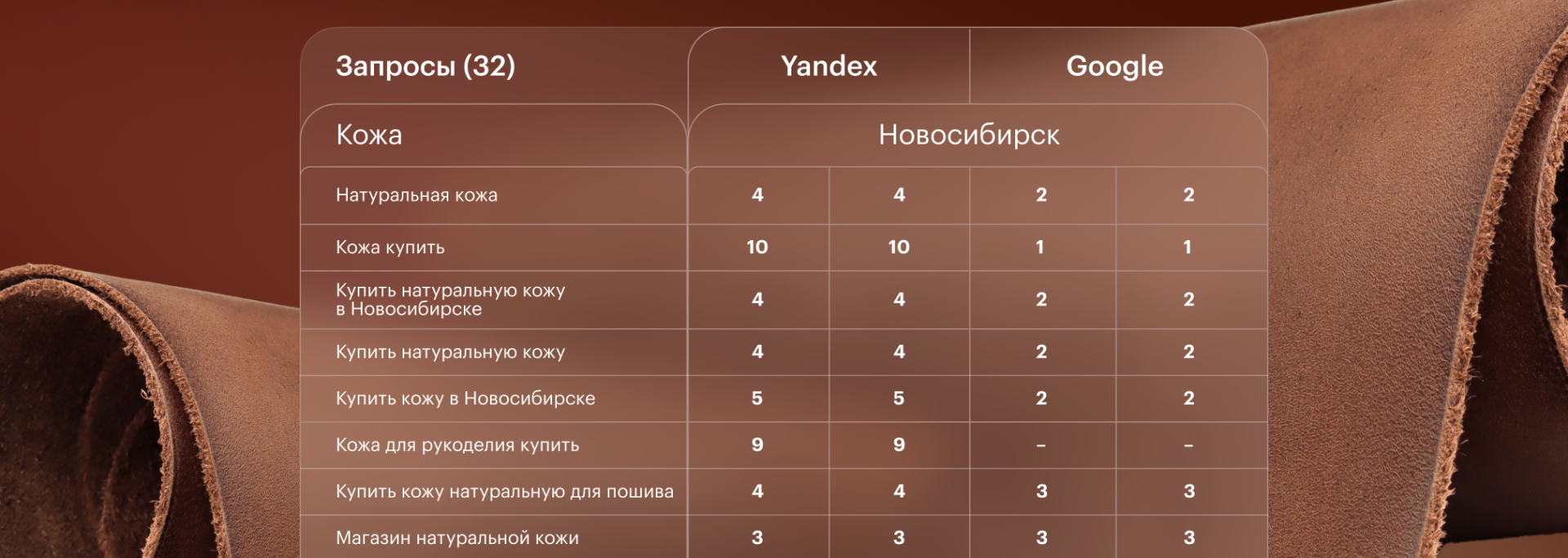 Клиент нуждался в трафике, чтобы получать заказы из своего интернет-магазина. Поэтому в работе с заказчиком ставка была сделана на техническую оптимизацию + локальное SEO — поисковое продвижение e-commerce в нише «кожа и фурнитура».