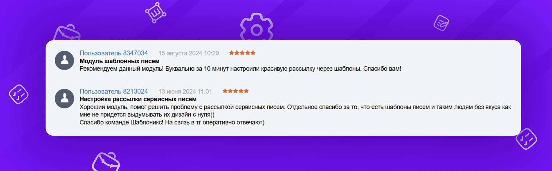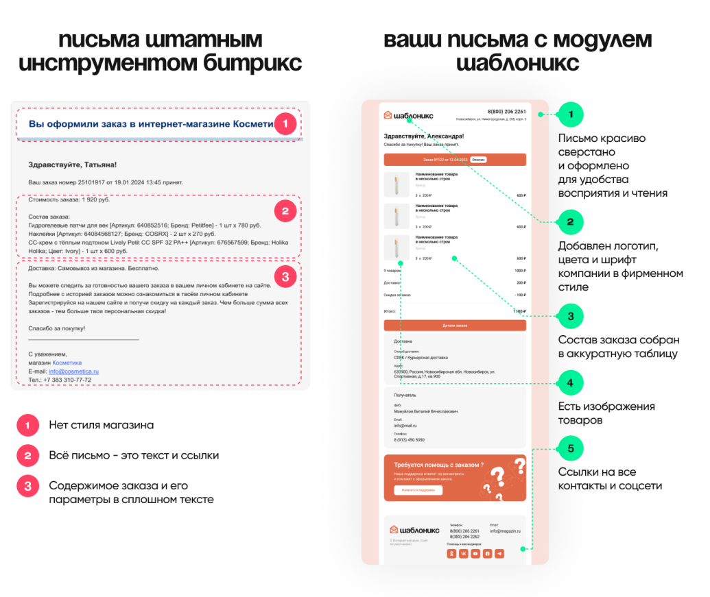 Шаблоникс — это результат практического опыта и реальной потребности рынка. Модуль родился из желания сделать e-mail-коммуникацию не только полезной, но и красивой. Благодаря Шаблониксу любой бизнес, работающий на 1С-Битрикс, может быстро настроить современные сервисные письма и этим повысить доверие и лояльность клиентов.